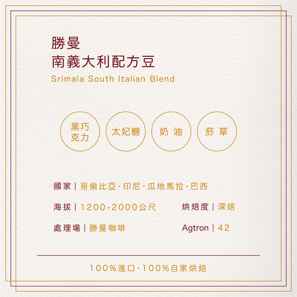精品咖啡豆 Specialty Coffee Bean熱賣推薦精選配方豆大洋洲精品豆中美洲精品豆南美洲精品豆非洲精品豆 曼郎中乾拌麵 Taiwanese Noodles 醬拌麵乾拌麵線 機台設備 MachineBFC 半自動咖啡機FAEMA 半自動咖啡機La Marzocco 半自動咖啡機WMF 全自動咖啡機JURA 全自動咖啡機DeLonghi 全自動咖啡機磨豆機烘豆機 咖啡相關商品 Commodity 虹吸式咖啡壺進口杯具手沖器具配件&濾紙美式咖啡機 "熱賣推薦精選配方豆大洋洲精品豆中美洲精品豆南美洲精品豆非洲精品豆"醬拌麵乾拌麵線"BFC 半自動咖啡機FAEMA 半自動咖啡機La Marzocco 半自動咖啡機WMF 全自動咖啡機JURA 全自動咖啡機DeLonghi 全自動咖啡機磨豆機烘豆機"虹吸式咖啡壺進口杯具手沖器具配件&濾紙美式咖啡機 Home 咖啡豆介紹 精品咖啡豆 熱賣推薦 勝曼南義大利配方豆〈半磅〉 風味|黑巧克力、菸草、太妃糖、奶油 產地|哥倫比亞、印尼、瓜地馬拉、巴西 處理場|勝曼咖啡 海拔|1200-2000公尺 烘焙程度|深烘焙(Agtron指數42) NT$ 250 - + 加入購物車 回列表